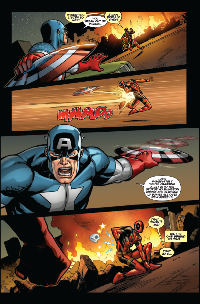 Deadpool is a terrorist?! That’s how Captain America sees it, but Cap doesn’t know there currently are two Deadpools in NYC--one who’s totally evil and one…well, one who’s not quite as bad. How will our dubious hero clear his name, get Captain America to not despise him, defeat the most formidable enemy he’s ever faced…oh, and evade capture by international law enforcement? Uh, who said he does?