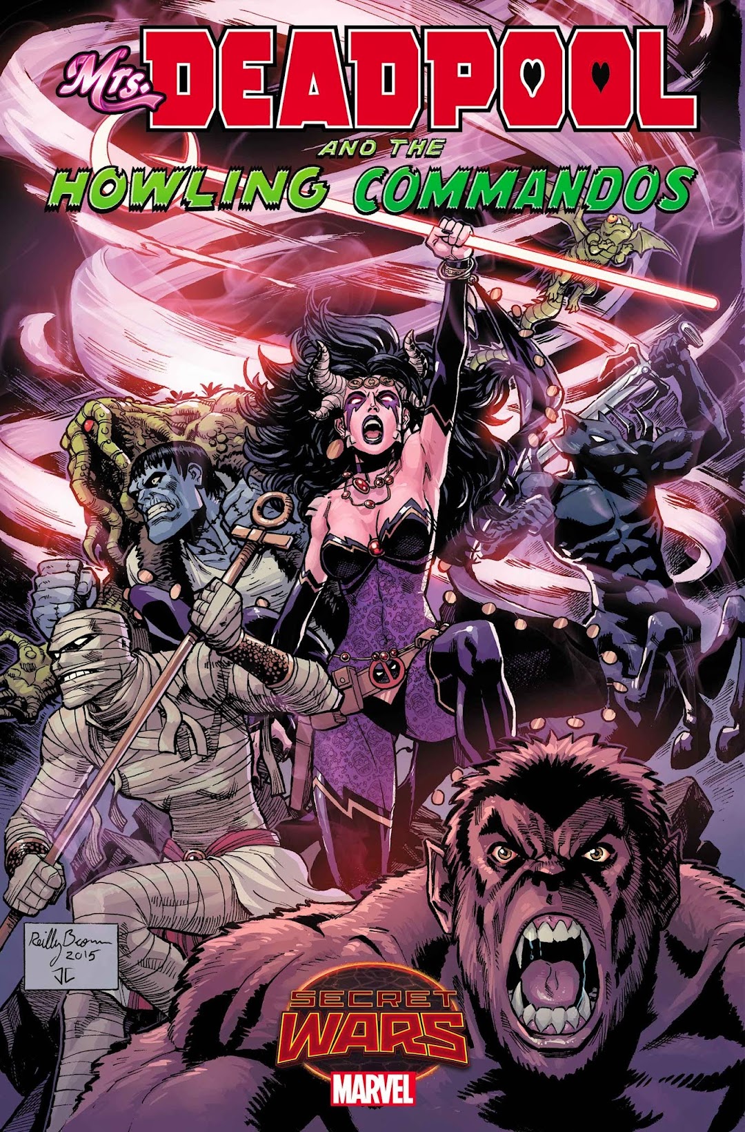 MRS. DEADPOOL AND THE HOWLING COMMANDOS #1!New York, NY—March 9th, 2015—This June, the strangest super-team of them all emerges from the depths of Monster Metropolis to take Battleworld by storm in MRS. DEADPOOL AND THE HOWLING COMMANDOS #1 – a new Secret Wars series! Blockbuster Deadpool scribe Gerry Duggan and artist Salvador Espin bring you an explosive new adventure as Deadpool’s betrothed and a monstrous legion venture across Battleworld and beyond!Monster Metropolis – an underground city buried deep below Manhattan. Brimming with monsters, creeps and spooks – Monster Metropolis is home to any and all things that go bump in the night. And it’s undisputed ruler is SHIKLAH, Queen of all monsters! In her world, she ruled over Monster Metropolis and was married to Deadpool, the Merc With a Mouth. But on Battleworld, nothing is what it once was. With her husband deceased and her city now residing beneath an entirely new planet, Shiklah now leads a super team unlike any you’ve seen before!Enter the Howling Commandos – the most monstrous team of them all! Werewolf-by-Night! Frankenstein’s Monster! The Living Mummy! Man-Thing! And Marcus the Centaur! Set loose on this new planet, these five creatures of the night and their fearless leader are ready to enter the Secret Wars fray. What will happen? No one knows. But one thing is for certain – Battleworld won’t know what hit it!“Shiklah managed to become an important figure in Deadpool and now we’re exploring her as a solo female lead and it’s been a lot of fun,” says Gerry Duggan in an upcoming interview with Marvel.com. “She finds herself in a difficult position at the top of MRS. DEADPOOL AND THE HOWLING COMMANDOS.”Sharpen those fangs and claws, because a deadly new super team is set to take Battleworld by storm this June. Be there when they’re let off the leash in MRS. DEADPOOL AND THE HOWLING COMMANDOS #1!For more information on Mrs. Deadpool And The Howling Commandos, head to Marvel.com and check back tomorrow for the full interview with Gerry DugganMRS. DEADPOOL AND THE HOWLING COMMANDOS #1
