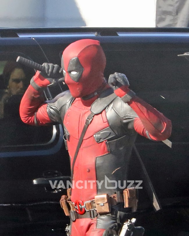 Vancity Buzz has posted new set photos of Ryan Reynolds in costume as Deadpool wielding katanas during the filming of the Deadpool movie. Reynolds joking mentioned on twitter that "The Katanas are named Bea and Arthur. Bea is a dedicated performer and a joy to work with. Arthur's grumpy-wumpy. " Thanks to Slayve for the tip. [SOURCE]