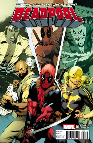 A Four-Part Crossover in One Issue – Your First Look at DEADPOOL #13!New York, NY—May 5th, 2016 — What do you get when you take a Merc With a Mouth, two Heroes for Hire and a Man Without Fear and mash ‘em together? Why, the massively oversized DEADPOOL #13 of course! This June, this quartet of heroes collide in the first-ever 4-part crossover in one issue! We’re not joking – this issue contains two full issues of Deadpool, one issue of Power Man and Iron Fist and one issue of Daredevil! Writers Gerry Duggan, David Walker and Charles Soule join forces with artists Jacopo Camagni, Guillermo Sanna, Elmo Bondoc and Paco Diaz to bring you one for the history books! When Deadpool takes a gig protecting a banker who betrayed his nefarious cartel partners, they seek the help of ADA Matt Murdock, who calls in the assistance (and fists) of Luke Cage and Danny Rand! Things are going to get ugly. Get ready for a mega-violent, street-level, gut-busting, face-punching, kung-fuing, ninjitsuing crime story you won’t want to miss! It all goes down this June when DEADPOOL #13 explodes into comic shops everywhere!DEADPOOL #13 (APR160998)